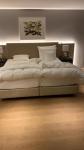 Unser Foto zeigt das Doppelbett in einer Suite eines süddeutschen 5-Sterne-Superior-Luxushotels. Das Golf-Ferien-Resort, in dem stets viele Millionäre und Milliardäre aus der ganzen Welt absteigen, prahlt mit höchstem Komfort. Der Milliardärs-Konzern, der das Luxushotel besitzt, hat seinem Direktor schier unglaubliche Finanzmittel zur Verfügung gestellt, um es auf den komfortabelsten Stand zu bringen, doch der Bettenkomfort darf kritisch hinterfragt werden. Unser aufgenommenes Bild zeigt eine noch im Februar 2020 teuer vermietete Suite mit zwei schmalen, aneinander gestellte Boxspringkästen, die mit zwei einzelnen Matratzen belegt und mit einem gemeinsamen Bettlaken bespannt sind. Da beide Matratzen bei intensivem Gebrauch nach rechts und links wandern können und das Bett dann einen sogenannten „Matratzen-Graben“ bilden kann, spricht man hier vermeintlich von einer „Matratzen-Schaukel“. Bei einem Kopfort-Doppelbett müsste der Boxspringkästen nach unserer Meinung eine Gesamtmatratze mit zwei getrennten Bettdecken vorweisen. Nur dann könnte man von einem Komfort-Bett für das traumhafte Schlafen in eine Luxushotel sprechen.
