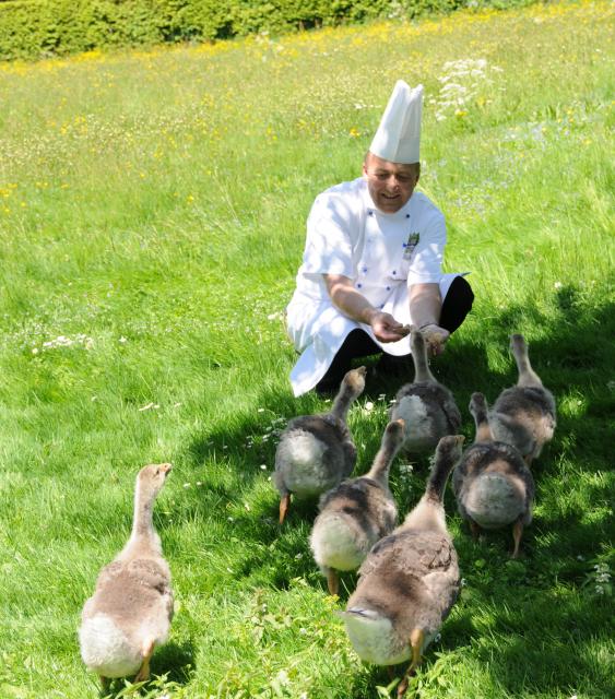 Küchenchef Martin Weißer als Ober-Gänserich unter seinen Graugänsen.