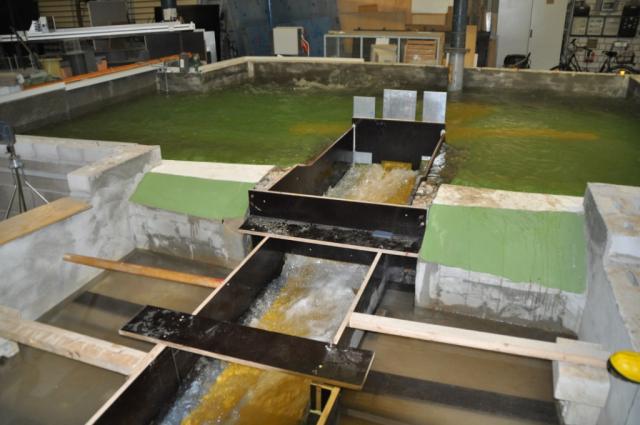 Zunächst wurde die siebenköpfige Gruppe in einem Seminarraum vom stellvertretenden Institutsleiter Boris Lehmann und dem Entwickler des Modells, Thomas Mohringer, in den Sinn des Modellbaus im Allgemeinen und den Zweck des Dietenbachmodells im Speziellen eingeführt. Für wasserbauliche Großprojekte, so die Experten, sei eine dreigliedrige Modellplanung aus Gründen der Planungssicherheit, der Machbarkeit sowie der Untersuchung von Varianten und der System- wie Prozessoptimierung notwendig. Von Mathematikern werden zunächst numerische Modelle erstellt. Hydrologen und Meteorologen liefern gesammelte Daten für die Aufstellung von statistischen Modellen. Schließlich werden, wie im Falle des Hochwasserrückhaltebeckens Dietenbach, physikalische Modelle, also maßstabsgetreue Nachbauten erstellt. Diese seien gerade im Wasserbau von großer Bedeutung, so Lehmann, da sich komplizierte Strömungen nicht 100%tig berechnen ließen. Anhand von Folien erläuterte Thomas Mohringer anschließend die Besonderheiten des Dietenbachbeckens. Eine Besonderheit sei, neben der Lage in einem Waldgebiet, das große Trogbauwerk mit „Überfallkanten“, über die im Extremfall Wasser austreten könne, wenn die drei motorbetriebenen Schützöffnungen blockierten und das Durchflussbauwerk durch Treibgut verstopft würde („worst- case“- Szenario). Ein weiteres Merkmal stellten die beidseitigen „Bermen“ im Durchlassbauwerk dar. Die 90 cm breiten erhöhten Kanten entlang der Abflussrinne ermöglichen es Tieren, das Bauwerk zu durchlaufen und so die Autobahn sowie die zukünftigen Bahngleise zu unterqueren. Ebenfalls zusammen mit Ökologen entwickelt wurden Ausstiegshilfen innerhalb der 7, 5 Meter breiten Unterführung, die es Tieren erleichtern sollen vom Wasser auf die „Bermen“ zu gelangen. Das Gesamtbauwerk sei bis zum BHQ2- Standard ausgelegt, also für Hochwasser gebaut, die statistisch nur alle 5000 Jahre vorkommen, erklärte Mohringer weiter. Aufgrund des Klimawandels, so die Wissenschaftler, wäre eine derartige Belastbarkeit keineswegs übertrieben.