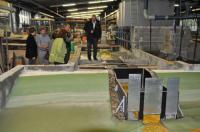 Nach soviel Theorie ging es für die Gäste aus Gottenheim und Umkirch nun „in medias res“. In der 2500m² großen Modellbauhalle des Instituts konnte das Rückhaltebauwerk im Maßstab 1:12 bei bewundert werden. Mit einem Knopfdruck erzeugte Wasserbauer Mohringer verschiedene Hochwasserstärken, bei denen das 50. 000- Euro- Modell seine Leistungsfähigkeit unter Beweis stellen konnte. Dass Modelle keine Geldverschwendung seien, erläuterte Lehmann auch unter einem recht greifbaren Gesichtspunkt: Das IWG übernehme für das spätere Originalbauwerk die Gewährleistung, zumindest was die von den Wissenschaftlern zu verantwortenden Berechnungen und ihre planerische wie bauliche Umsetzung beträfe.
