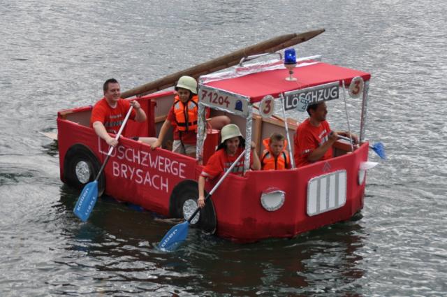 Während die Bootskategorien Schlauch-, Festkörper- und Badeboot bereits um 14 Uhr 30 beim Kieswerk Uhl gestartet waren und unterwegs zahlreiche Aufgaben wie Riesenpuzzle oder die berüchtigte Dschungel- Brücke in möglichst kurzer Zeit bewältigen mussten, kam es für die drei „Fantasyboote“ darauf an, die kürzere Strecke vom Beginn (16 Uhr 30) am Möhlinwehr bis zur Wachstation schwimmend zu überstehen und dabei mit einem möglichst originellen Boot an den Start zu gehen. Während „Elvis im Cadillac“ die Wachstation vergleichsweise zügig erreichte, brauchten die „Löschzwerge“ über eine Stunde für die rund zwei Kilometer. Vom DLRG- Boot in Schlepp genommen wurde das „G- Team“, dessen Besatzung auf dem letzten Streckenabschnitt meuterte und teilweise über Bord sprang.