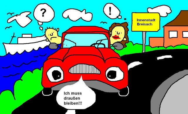 Vielleicht ist es übertrieben, bei einem Spaziergang entlang der Richard- Müller- und Rheinstraße oder dem Gutgesellentor- und Neutorplatz von einem Bummel mit Bammel zu reden. Jedenfalls solange wie man kein Kind, alter Mensch oder Mensch mit Gehbehinderung ist. Als „gesundes Mittelalter“ ist man von einem Fußmarsch entlang der betreffenden Breisacher Straßen bestenfalls genervt. Als Radfahrer geht es einem wenig besser, man hat es nur schneller hinter sich. Und dies ganz besonders, wenn man hier während des Feierabendverkehrs oder am Wochenende zu Gehen oder Radeln beliebt. Eine wahre Herausforderung für Mutige ist am Wochenende, insbesondere an einem schönen Sonntag, die Rheinuferstraße. Auch Freunde des Abenteuerurlaubs kommen in der „30er“- Zone direkt am Rhein voll auf ihre Kosten. Zwar wurde versucht, mittels eines üppigen Schilderaufkommens des motorisierten Durchgangs- und Flanierverkehrs Herr zu werden, aber aufgrund des herrlichen Rheinblicks übersehen die meisten Autofahrer wohl die Halteverbots- und Zone- 30- Schilder. Der langsame Fußgänger hingegen wird mit diversen Schildern („Fußweg zur Innenstadt“) weg vom Rheinufer auf einen vor der Automasse durch eine Hecke beziehungsweise einen Metallzaun geschützten Gehweg gelotst. Dieser allerdings quillt am Wochenende vor geflüchteten Spaziergängern nahezu über, außerdem nötigt der Sicherheitszaun vor der Linkskurve in Richtung Schiffsanlegestelle die Fußgänger, die auf den Fußweg direkt am Rheinufer oder zum Weinbrunnen auf die andere Straßenseite wechseln wollen zur gefährlichen Zaunübersteigung oder einem Umweg entlang des Spielplatzes. Natürlich hat der Zaun seine Berechtigung: Das riskante Überqueren der Straße in der unübersichtlichen Kurve soll vermieden werden - da die Straße voll von Autos ist, von denen die wenigsten mit Tempo 30 unterwegs sind. Weil man zu Fuß also nur sehr schwer an den Rhein kommt, und offensichtlich viele Menschen auch eine etwas befremdliche Vorstellung von einem Sonntagsspaziergang haben - man fährt mit dem Auto direkt an den Rhein, parkt am Besten direkt an der Rheinuferstraße, steigt aus, geht drei Schritte hin und drei zurück und fährt dann in die ca. 300 Meter entfernte Innenstadt am besten direkt vor ein Café zum Kaffee trinken - fahren viele Wochenendbesucher direkt an den Rhein und stellen dort ihre Fahrzeuge ab. Vom „Fußweg in die Innenstadt“, dem sicheren hinter der Hecke, aus ist der Rhein an solchen Tagen vor lauter abgeparkter Blechwand bis hinter die Europabrücke fast nicht mehr zu sehen.