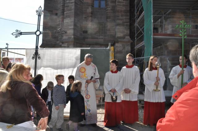 Im Rahmen des Pfarrfestes wurden am Sonntag, den 03. Oktober 2010, die Kreuze für die sanierten Türme des Breisacher St. Stephans Münsters zunächst gesegnet und dann via Baulift auf ihre angestammten Plätze transportiert. Bei strahlendem Sonnenschein hatten sich zahlreiche Gläubige und Freunde/Innen des Breisacher Wahrzeichens auf dem Münsterplatz versammelt, um dem feierlichen Augenblick beizuwohnen. Umrahmt von den Klängen der Stadtmusik Breisach segnete Münsterpfarrer Peter Klug die beiden schlichten Eisenkreuze, die für hoffentlich viele Jahrzehnte die frisch renovierten Münstertürme zieren und auf die Stadt am Rhein herabschauen werden.
