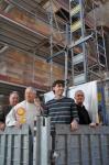 Nicht nur die Sonne strahlte, als gegen halb 12 die Gottesdienstbesucher aus dem Münster kamen, um der feierlichen Segnung der Kreuze beizuwohnen. Viele fleißige Helfer/Innen hatten den Münsterplatz zuvor in einen Festplatz verwandelt. Münsterpfarrer Peter Klug segnete nach einigen kurzen Dankesworten umrahmt von Ministranten die Turmkreuze, von denen eines bereits auf dem Baulift befestigt worden war. Pfarrer Klug forderte vor allem die Kinder auf, die Kreuze einmal anzufassen, da sich diese Gelegenheit wohl so bald nicht mehr ergeben würde. Lange Hälse bei Alt und Jung gab es, als der Pfarrer, der zuständige Bauleiter Architekt Theo Hirschbihl, Dr. Erwin Grom und Martin Hau vom Münsterbauverein sowie Steinmetzmeister Dietmar Baader mit Lift und Kreuz unter den Klängen der Stadtmusik Breisach den Turm entlang gen Himmel entschwebten. Wenig später kamen die Herren ohne Kreuz aber wohlbehalten zurück. Vor dem Fahrstuhl hatte sich bereits eine stattliche Schlange gebildet, denn in Vierergruppen gab es nun für die Mutigen unter den Festbesuchern/Innen die Möglichkeit, auf die Türme zu fahren und sich den Standort der Kreuze aus der Nähe sowie die Heimatstadt von oben zu besehen. Wer nicht Fahrstuhl fahren, aber trotzdem Schlange stehen wollte, hatte dazu vor dem Getränkestand Gelegenheit. Während es von der Kolpingfamilie Schweinebraten gab, konnte man sich nebenan an „Ministrantenwurst“ gütlich tun. Für die Naschkatzen gab es frische Waffeln. Eine besondere Atmosphäre versprach die Kaffeestube, denn für den Genuss von allerlei Kuchen und Torten hatte für den Festtag die sonst verschlossene Krypta von St. Stephan geöffnet. Bereits nach kürzester Zeit waren bei sommerlichen Temperaturen alle Tische besetzt. Einen schöneren Auftakt für die anstehende Beendigung der Renovierungsarbeiten am Breisacher Wahrzeichen hätte sich wohl keiner der Anwesenden vorstellen können.