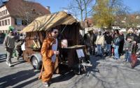 Bereits vor Beginn des Umzugs stärkten sich viele Besucher/Innen auf dem sonnenverwöhnten und inzwischen auch Baumgruppen gezierten Gutshofplatz bei Bier, Würstchen oder Narrensuppe. Denn ein kluger Narr weiß, dass es beim Fasnet Feiern neben einem originellen Kostüm vor allem auf die Unterlage ankommt.