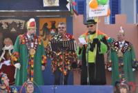 Tanzende große und kleine Räuber/Innen überfielen anschließend den Marktplatz, um dem Kaiser die Schatzkiste zu rauben und die Zuschauer/Innen mit einem Tanz zu begeistern. Das Spektakel hatte sich der Breisacher Damenzunftrat einfallen lasssen. Extrem unsportlich fählte sich sicher so mancher Narr bei der Lara- Croft- Show der Förderriege des TV- Breisach. Und auch die Ägypterinnen von „Tanz und Bwewegung“ riefen rhythmisch ins Bewußtsein, dass man ohne Sport schnell zur Mumie verkommt. Unter der Leitung von Ramona Schmidt zeigten die Brisacher „Kläpperle Buebe“, unter denen übrigens auch Mädchen sind, das ma mit zwei Holzbrettchen klappern und dabei gleichzeitig tanzen kann. Die „Gaukler- Kinder“ zeigten bei ihrer Einradshow „Punker und Rocker“, dass auch junge Narren schon voller Opferbereitschaft zur Sache gehen. Zwei der beteiligten Mädchen radelten mit Gipsarm! Einen Ausflug in den Osten Europas machten die Panduren aus Hochstetten bei ihrer Aufführung „Tanz der Geigen“. Die Guggenmusik „Schädelfätzer“ zeigte zum einen, dass schräg auch schön sein kann und zum anderen, dass man sich bei der Männergugge keine Nachwuchssorgen machen muss. Der Dirigent des Auftritts war nämlich kaum größer als eine Trompete. Klassiker aus dem Kultfilm der 80er Jahre lieferten die „Blues Brothers“ der „Rhiwaldhexen“. Anschließend kämpften die „Brysacher Hofnarren“ erst mit Flatterbändern und dann mit Boxhandschuhen. Allerdings ging so mancher Zuschauer schon beim Anblick des Nummerngirls k. o.! Atemberaubend war der Auftritt des Motorrad- Artisten Mike Auffenberg aus Thüringen, der bereits im vergangenen Jahr gezeigt hatte, wie es aussieht, wen jemand wirklich Motorrad fahren kann. Den Höhepunkt seiner PS- Show bildete der Sprung über ein mit mutigen Hofnarren besetztes Riesenquad. Gefühlt 1000 bunte Clowns bevölkerten anschließend den Platz. Wie es Sabrina Mastrocola gelungen ist, mit der vielköpfigen Rasselbande einen Tanz einzustudieren, bleibt ihr Geheimnis. Allein das Nähen der Kostüme muss Jahre gedauert haben. Der langen Tradition der Fasnacht in Breisach war das Narrennest „Algerio“ auf die Spur gekommen. In einer Steinzeithöhle hatten sie mit Hilfe von Stadtarchivar Uwe Fahrer den Urnarren entdeckt.