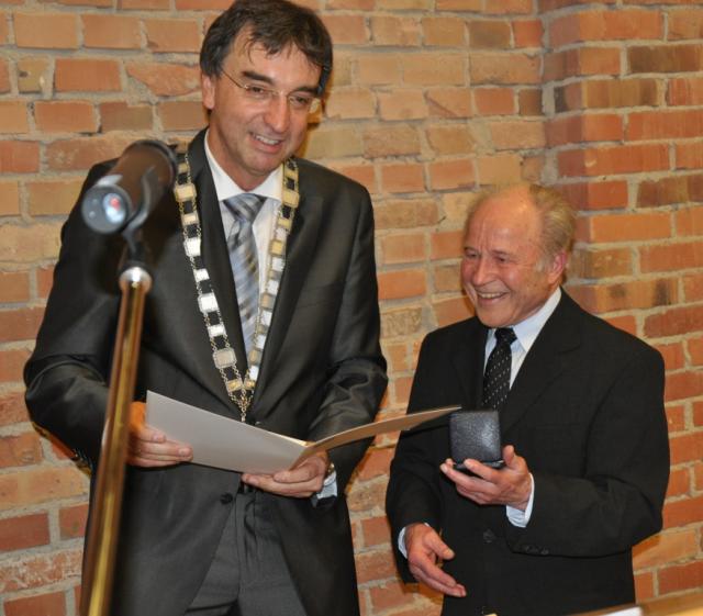 Scheut den großen Auftritt mit Amtskette: Bürgermeister Walter Laub ( hier mit Pfr. Kurt Hilberer) (Bild: J. W. Steckmeister)