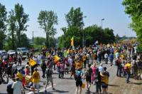 Gegen halb 12 strömten bereits zahlreiche Demonstranten/Innen von Ost und West, teils in Schutzanzügen oder gelb beflaggt auf die zunehmend voller werdende Rheinbrücke. Gegen halb 1 war die Brücke belegt und der Zug kam ins Stocken.