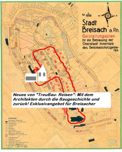 Ausschlaggebend für die Neukonzeption der Reiseroute „Bebauung Kettengasse“ waren mangelnde Kundenzufriedenheit sowie behördliche Einsprüche, so der "Reiseveranstalter". Die Tour in die architektonische Moderne, die die TreuBau für den im Jahre 2009 von der Stadt erworbenen Grund zwischen Ketten- und Ursulinengasse vorgesehen hatte, ging zunächst vielen Breisachern/Innen und schließlich auch dem Denkmalamt zu weit, das zunächst eine "Reisewarnung" und dann das Aus Richtung Bauhaus- Stil aussprach. Nun, so die öffentliche Stellungnahme des in Breisach bereits in der Kupfertorstraße mit Pauschalreisen in Quaderform tätigen Anbieters, gibt es etwas völlig Neues für die kritische Klientel am Münsterberg. „Die Treubau ist der Stadt sehr entgegen gekommen“, so Architekt und „Reiseleiter“ Michael Fischer. Eine interessante, ja vielleicht sogar abenteuerliche These! Aber Abenteuerreisen liegen voll im Trend.