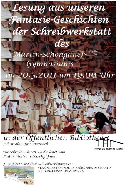 Seit dem Schuljahr 2009/2010 ist die Schreibwerkstatt eine feste Einrichtung am Martin-Schongauer-Gymnasium. Möglich wurde das durch die großzügige Unterstützung des Fördervereins der Schule und andere Sponsoren.