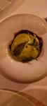 Von Geßler selbst gemacht Cappelletti aus Bärlauchteig (Bärlauch habe er aus Schlier, gesammelt und im Paco-Jet-Becher konserviert), gefüllt mit Burrata und Salzzitrone, bildeten die Basis. Das glasierte Kalbsbries erhielt Unterstützung durch klassisch gekochten Dashi mit Bonitoflocken. Gepufftes Reispapier mit schwarzem Knoblauchgel rundete die Aromen
