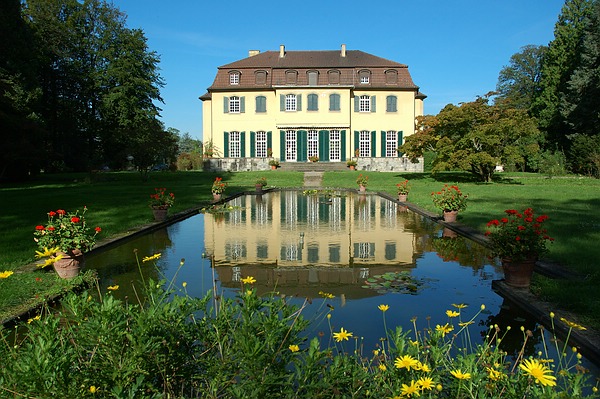 Queen-Auguste-Victoria-Park: Das historische Wasserbecken vor dem Schloss mit perfekter Spiegelung
