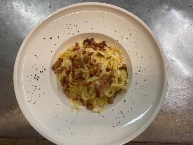 Francesco Caridi: Freiburgs König des Pasta-Renners „Spaghetti alla Carbonara“ mit Teller ohne Dekoration.