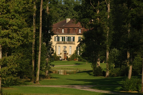 Am Ende des Tunnels aus Bäumen im Baum-Fenster des Queen-Auguste-Victoria-Parks: Das Schlösschen