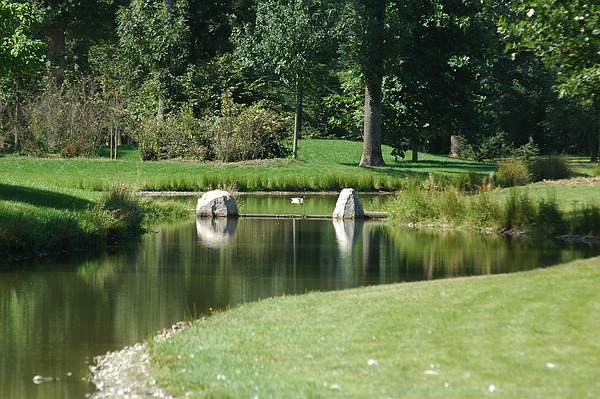 Parkschöpfer und Fotograf haben offenbar Sinn für Harmonie: Eine Ente genau in der Mitte des Steinwehres
