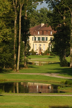 Ein Gartenkünstler war am Werk: das Schloss spiegelt sich hintereinader in allen drei Teichen des Auguste-Victoria-Parks
