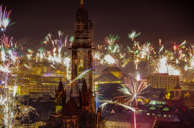 Das Feuerwerk geht zu Silvester über den Dächern von Freiburg ab: Im Schlossberg-Restaurant Dattler.