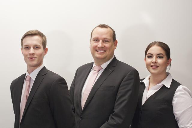 Maître d’hôtel Maximilan Fehse mit Dennis Liskowskis und Julia Achtelstetter in der Kursürstenstubne am Europäischen Hof in Heidelberg-.