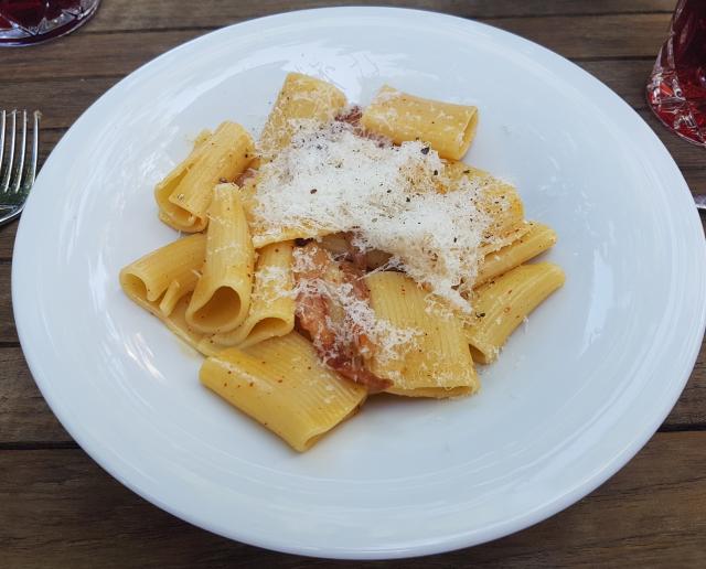 Auch deutsche Köche können Prima-Pasta kochen: Die Kreuzeck-Carbonara mit Rigatoni, aber mit den Original-Carbonara-Zugaben.