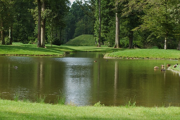 Hinter dem Wasser wirkt der Erdkegel im Queen-Auguste-Victoria-Park beruhigend und sanft