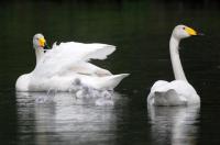 Die Umkircher Singschwäne steigen für ihre Flugrunden immer wieder in den Umkircher Himmel auf, doch sie blieben dem Queen-Auguste-Victoria-Park treu. Schwäne zählen zu den Welt-Meistern der Monogamie; ein Schwanen-Paar bleibt sich lebennslang treu. Dieses Jahr hat sich das Singschwäne-Paar für die Geburt ihrer Jungen Christi Himmelfahrt ausgesucht. An diesem 40. Tag des Osterfestkreises feiern die Christen die Rückkehr Jesu Christi als Sohn Gottes zu seinem Vater in den Himmel. Nach 35 Brut-Tagen erblickten am 17.5.2012 vier junge Singschwäne in Umkirch das Licht der Welt. Wie der Name schon sagt, kann der Singschwan ausdrucksvoll singen. Aus dieser Eigenschaft leitet sich seit der Antike die metaphorische Gleichsetzung des Schwans mit dem Dichter her. Singschwäne sind auch auf der finnischen 1-Euro-Münze abgebildet. Die Singschwäne (Wissenschaftlicher Name Cygnus cygnus) gehören zur Familie der Entenvögel in der Gattung der Schwäne. Es sind Brutvögel der osteuropäischen und sibirischen Taiga. In Umkirchs Queen-Auguste-Victoria-Park wurden vor rund 15 Jahren zwei Pärchen Singschwäne ausgesetzt. Sie brachten inzwischen zahlreiche Jungen zur Welt. Jedes Jahr werden die Jungschwäne (wenige Tage nach ihrer Geburt) schon Opfer von Raubvögeln. Im letzten Jahr hat nur ein Jungschwan überlebt. Dennoch ist das Ensemble des Umkircher "Singschwan-Orchesters" in den letzten Jahren auf insgesamt 12 Mitglieder (Singschwäne) angestiegen. Nachdem Park-Fotograf Achim Keller die Schwäne aufgenommen hatte beobachtete auch Singschäne-Fotograf Werner Trageiser Umkirchs Entenvögel; es gelangen ihnen erstaunliche Schnappschüsse.