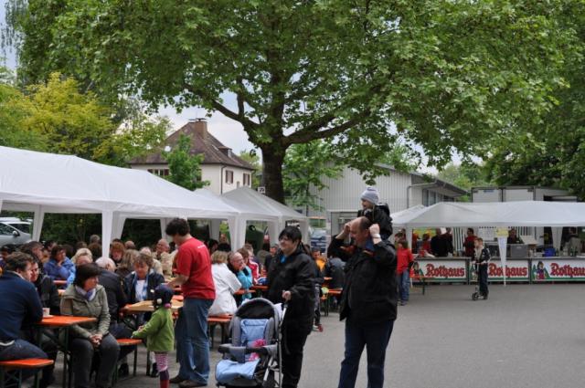 Aber auch auf mehr Nass von Oben waren die Musikanten vorbereitet, denn bereits am Samstag hatten fleißige Hände auf dem Parkplatz vor dem Vereinsheim ein Dach für die Kapellen und Zelte für die Besucher aufgebaut. Von 08:15 bis 18:00 Uhr gab es auf dem zum Festgelände umfunktionierten Platz frisch gezapftes Bier, Steaks und Grillwürste sowie Kaffee und Kuchen und natürlich musikalische Unterhaltung durch die Stadtmusik und die Gastmusikanten vom Bürgerlichen Krankenverein e. V. Und da neben diesen Spezialitäten für Kehle, Gaumen und Gehörgang auch der Wettergott ein Einsehen hatte, war der Hock bis in die Abendstunden gut besucht, und man darf den Stadtmusiker/Innen wünschen, dass so mancher Euro in die Vereinskasse gespült wurde.