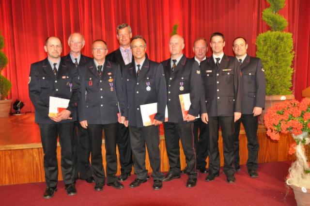 Den Abschluss des offiziellen teils bildeten die feierlichen Ehrungen verdienter Feuerwehrmänner. So wurde Heinrich Wiedensohler für seine 50jährige Mitgliedschaft bei der Breisacher Wehr zum Ehrenmitglied ernannt. Über das Ehrenzeichen in Silber des Deutschen Feuerwehrverbandes konnten sich Norbert Ciesiolka, Joachim Fuchs, Karl Heinz Meckel und Jörg Weber freuen. Mit Schnittchen und kühlen Getränken endete die Auftaktveranstaltung zum Jubiläumswochenende der Breisacher Freiwilligen Feuerwehr.