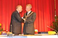 Nach der Begrüßung zahlreicher Ehrengäste, unter denen sich neben Ministerpräsident a. D. Erwin Teufel und dem Landtagsabgeordneten Christoph Bayer sowie den Breisacher Altbürgermeistern Fritz Schanno und Alfred Vonarb selbstverständlich auch die Bürgermeister der drei Partnerstädte Jean Ueberschlag, Richard Alvarez und Janusz Marszalek mit Delegationen aus ihren Gemeinden befanden, dankte Bürgermeister Rein zunächst Professor Werner Nickolai. Nicht zuletzt seinem Engagement, so Rein, sei es zu verdanken, dass vor einem Jahr die Partnerschaft mit Oswiecim (Auschwitz) zustande gekommen sei, die gerade deshalb von außerordentlicher Bedeutung wäre, weil sie für die Deutschen eine „brutale Konfrontation mit der Geschichte“ darstelle. Für die jüngste Breisacher Städtepartnerschaft empfinde Rein vor allem Dankbarkeit gegenüber den Bürgern von Oswiecim. Als „Motor für Europa“ bezeichnete das Breisacher Stadtoberhaupt die deutsch- französische Aussöhnung. Breisach und Saint Louis feierten mit ihrer im Jahr 1960 begründeten „Jumelage“ in diesem Jahr „Goldene Hochzeit“, was ja nur passiert, „wenn man sich sehr lieb hat“, so der Bürgermeister.