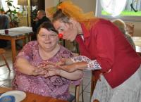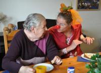 „Gell, Sie haben doch einen Hund“, ruft eine ältere Dame, als Margrita R. Wahrer, die die Heimbewohner/Innen nur als „Frau Blume“ kennen, den Aufenthaltsraum betritt. Jetzt muss auch Frau Wahrer einen Augenblick nachdenken. Tatsächlich hatte sie vergangenen Monat einen Hund dabei, als sie das Pflegeheim besuchte. Aber im Gegensatz zur demenzkranken Patientin hatte sie das für einen Moment glatt vergessen. Nicht alle der Patienten/Innen, die bei Kaffee und Kuchen im Aufenthaltsraum sitzen, zeigen gleich zu Beginn Interesse an der fröhlichen Frau mit der roten Nase und der großen Stoffblume im Haar. Andere jedoch scheinen die Clownin bereits sehnsüchtig erwartet zu haben. Und weil heute auch noch einer von der Zeitung da ist, zumal mit großer Kamera bewaffnet, werden aus einigen Patientinnen im Hand umdrehen junge Mädchen, die möglichst vorteilhaft in die Kamera blicken wollen. „Frau Blume“ steigt gleich auf das Thema ein und bewundert neidvoll den Nagellack einer der Damen. Klar, dass sie so was auch haben will. „Leider nein!“ Pflegerin Elvira schüttelt lachend den Kopf, denn Nagellack hat sie keinen dabei. Aber einen roten Filzstift, den kann sie „Frau Blume“ anbieten. Und weil der Kaffeegast sich so ungeschickt anstellt, beim Fingernägellackieren, helfen zwei der Bewohnerinnen auf Nachfrage der schönheitsbewussten Clownin sofort tatkräftig mit. Einige Patientinnen öffnen sich erst langsam, um mit der bunt gekleideten Frau, die von Tisch zu Tisch geht, ein paar Worte zu wechseln. Wo denn der Hund sei, will die Dame vom Anfang wissen. Den hat sie immer noch nicht vergessen, sogar haargenau beschreiben kann sie ihn. „Frau Blume“ erklärt, dass es sich nur um einen geliehenen Hund gehandelt hat. Die Enttäuschung ist merkbar, aber ein Foto gemeinsam mit der Clownin ist immerhin eine kleine Entschädigung. Einer weiteren Patientin ist der ganze Rummel zu viel. Sie beschwert sich über die Lautstärke im Raum. Aber Margrita R. Wahrer beherrscht auch die leisen Töne. Und die Diplom Sozialpädagogin mit Schauspiel- und Clownausbildung ist auch professionell und sensibel genug, um zu wissen, wen sie lieber ganz in Ruhe lässt. Die Verfassung der Patienten/Innen schwankt von Tag zu Tag. Manche sind auch zunehmend weniger ansprechbar. Bettlägerige Patienten/Innen besucht Margrita R. Wahrer auf Wunsch in ihren Zimmern. Hier aber soll die Kamera draußen bleiben. Einige Patienten/Innen, so die Clownin, hat sie bis kurz vor ihrem Tod begleitet. Manche sind ihr über die Jahre ans Herz gewachsen. Der Besuch der Clownin ist eine willkommene Abwechslung im sonst durchorganisierten Tagesablauf der Heimbewohner/Innen. Denn feste Termine geben Halt in einer Welt, die nach und nach zu verschwinden droht. Neben allerlei Piktogrammen sind Orte und Veranstaltungen teilweise in „Sütterlin“ geschrieben. Auch die alte Schrift soll Erinnerungen wecken. Aber eine Schauspielerin, die mit Demenzkranken arbeitet?! Bringt das was? Eine der Pionierin der Arbeit mit Demenzkranken ist die deutsch- amerikanische Gerontologin und Sozialpädagogin Naomi Feil. Insbesondere für das Personal in Pflegeheimen mit Demenzpatienten entwickelte Feil die Methode der „Validation“. Grundsatz dieser „Umgangsmethode“ ist die Feststellung, dass auch alte, verwirrte Menschen würdevolle Individuen sind, die es mit Achtung und Respekt zu behandeln gilt. Dies soll sich nach Feil auch in der Kommunikation mit Demenzpatienten niederschlagen, indem man ihnen zuhört und auf „ihre Themen“ eingeht, auch wenn viel des Gesagten für den gesunden Menschen vielleicht unsinnig erscheint. Dieses Talent hat Margrita R. Wahrers Kunstfigur „Frau Blume“. Kein Wunder eigentlich, denn auch die berühmte Naomi Feil ist im Drittberuf Schauspielerin.