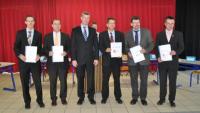 Auf gute Zusammenarbeit! Schüler mit Kooperationspartner Uwe Männel (Rhodia Acetow) (Bild: J. W. Steckmeister)