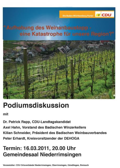 Zu einer Podiumsdiskussion mit regionalem Schwerpunkt lädt am Mittwoch, den 16. März 2011, der CDU- Ortsvereine Breisach ein. Thema des Abends wird die geplante Aufhebung des Weinanbaustopps innerhalb der Europäischen Union sein. Die Veranstaltung beginnt um 20 Uhr im Gemeindesaal in Breisach- Niederrimsingen.