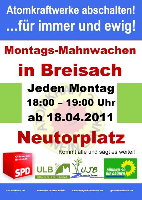 Schon die von der Umweltliste Breisach Mitte März 2011 ins Leben gerufene Mahnwache hatte schnell großen Zulauf gefunden. Die neue Aktion wird im Gegensatz zu ihrer täglichen Vorgängerveranstaltung im Stile der Montagsdemonstrationen nun immer am ersten Werktag der Woche stattfinden. Einen vorläufigen Protesthöhepunkt erreicht die Montagsmahnung am Ostermontag, den 25. April auf der Rheinbrücke Breisach. Um fünf nach 12 wird hier wie auf fünf weiteren Rheinbrücken für die Abschaltung des AKW in Fessenheim demonstriert.