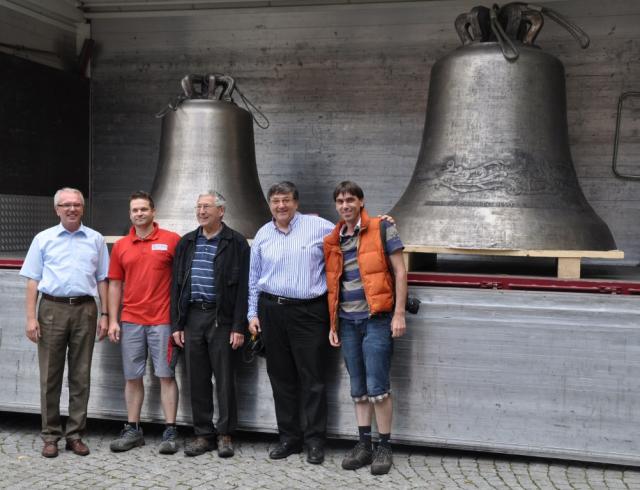 Glocken Umladen erfolgreich: Erleichterung bei Freddo Dewaldt (Weintrans), Pfarrer Peter Klug, Dr. Erwin Grom und Martin Hau (Bild: J. W. Steckmeister)