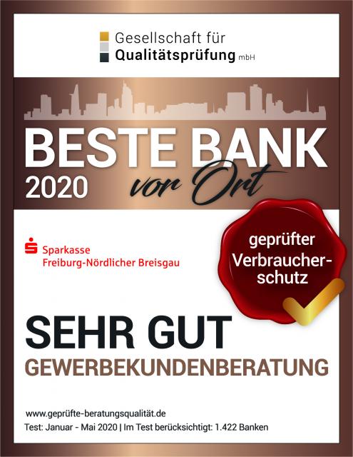 Qualitäts-Triple mit Bestnote SEHR GUT für Sparkasse Freiburg-Nördlicher Breisgau: Beste Bank vor Ort nach Qualitäts-Test.  17197  24.08.2020