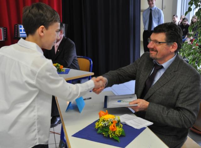 Auf gute Zusammenarbeit! Schüler mit Kooperationspartner Uwe Männel (Rhodia Acetow)