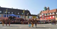 Eine weitere tänzerische Darbietung in aufwendigen Kostümen legten die Paradiesvögel auf das Marktplatzparkett. Eva und Annika Okic hatten den Tanz mit den Vögeln aus dem Fitnessstudio für die Fasent einstudiert. Eine weitere Damenmannschaft zog mit den „Bajakl Schnäpfe“ auf dem Marktplatz ein. Besonders frenetisch begrüßt wurde der Schnäpfenneuzugang Florian „Hert(h)a“ Herth. Der Bauverwaltungsamtsleiter hatte bereits nach der Rathausstürmung am schmutzigen Donerstag und auf Anordnung der neuen Machthaber den Amtswechsel zum „Täfelebueb“ der Frauen- Gugge vollzogen.