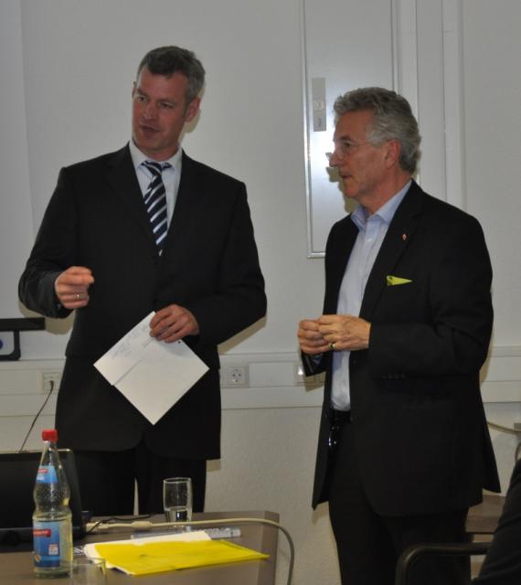 Die zentrale Lage der rund 21.000 km² großen Region gereicht den ansässigen Firmen zum Vorteil, ist allerdings auch eine große Aufgabe, so Dischinger weiter. Wie leistungsfähig die Arbeitnehmer/Innen und Arbeitgeber/Innen sind, zeigt das enorme Bruttosozialprodukt von 202 Milliarden Euro, das vor Ort erwirtschaftet wird. „Wir haben unser Öl im Gehirn“, so Dischinger über das Land ohne Bodenschätze aber voller Innovationen. Modellcharakter habe zudem die „Offenburger Erklärung“ vom 09. Dezember 2010, in der die Gründung der Trinationalen Metropolregion Oberrhein schriftlich besiegelt worden ist. Eine Zusammenarbeit zwischen zwei europäischen Staaten und der Schweiz ist bisher einzigartig. Die vier Säulen des staatenübergreifenden Netzwerkes sind neben der Wirtschaft die Politik, die Wissenschaft und die Gesellschaft, erläuterte Dischinger die Besonderheiten der Organisation.