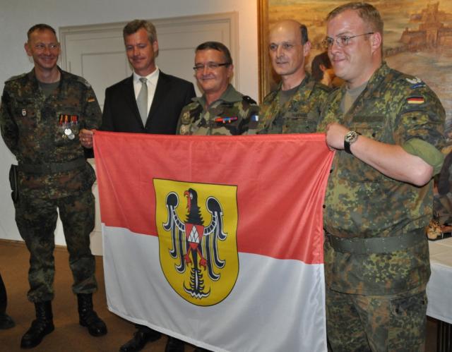 Für die Soldaten, die im Juli nach Afghanistan fahren, gab es vom Bürgermeister eine Breisachwappen- Flagge als Erinnerung an die gemütliche Stadt mit langjähriger Militärtradition.