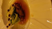 Von Geßler selbst gemacht Cappelletti aus Bärlauchteig (Bärlauch habe er aus Schlier, gesammelt und im Paco-Jet-Becher konserviert), gefüllt mit Burrata und Salzzitrone, bildeten die Basis. Das glasierte Kalbsbries erhielt Unterstützung durch klassisch gekochten Dashi mit Bonitoflocken. Gepufftes Reispapier mit schwarzem Knoblauchgel rundete die Aromen