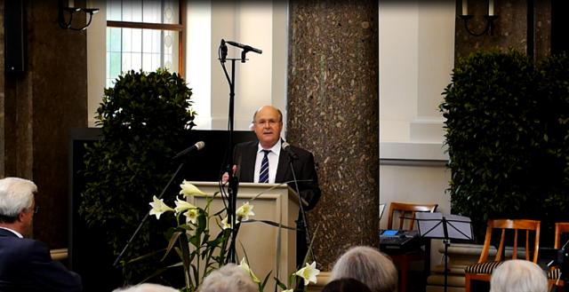 Freiburgs „Monsieur Adieu“  Bernhard Keller bei seiner Rede im Friedhofs-Dom zu Freiburg.