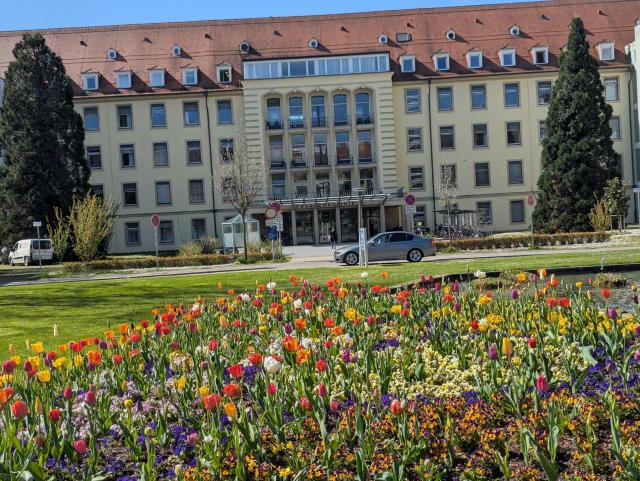 Mediznischer Universitätsklinik Freiburg: Blick in den Park vor dem Klinikum