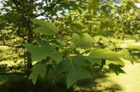 Liriodendron tulipifera „Aureomarginatum“ mit einem breiten gelben Blattrand im Queen-Auguste-Victoria-Park blühen jetzt die Tulpenbäume (Bild: Achim Keller)